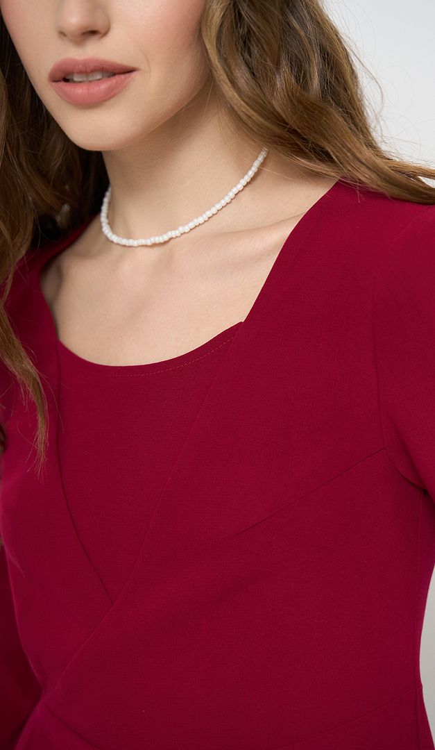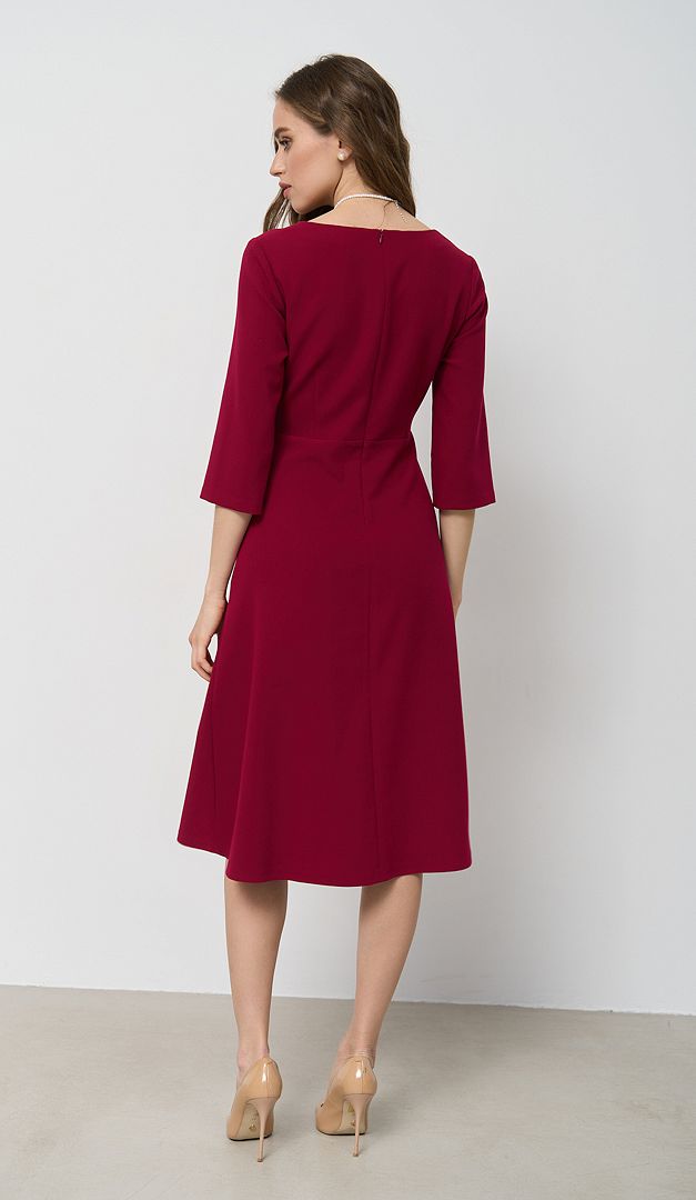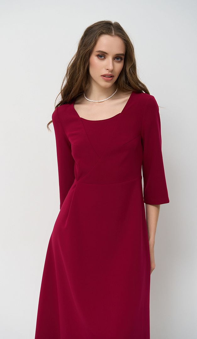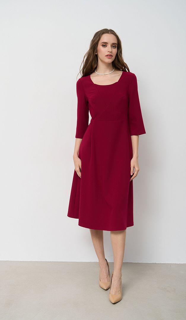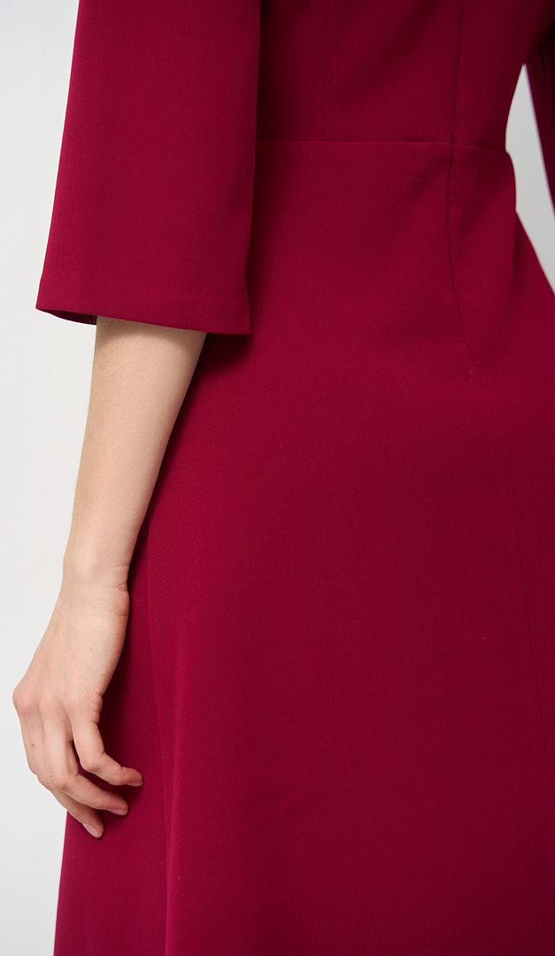 Базова сукня трапеція малинова допоможе створити стриманий і водночас жіночний образ. Модель має практичний та універсальний для всіх типів фігур А-силует — зі злегка завищеною лінією талії і розкльошеною, м'яко лягаючою спідничною частиною. Більш витончено виглядає виріб завдяки облягаючому верху з відкритим вирізом горловини. Рукав — прямий, напівприлеглий, довжиною «3/4». Сукня трапеція малинова застібається на «блискавку» в середньому шві задньої частини. Без підкладки.