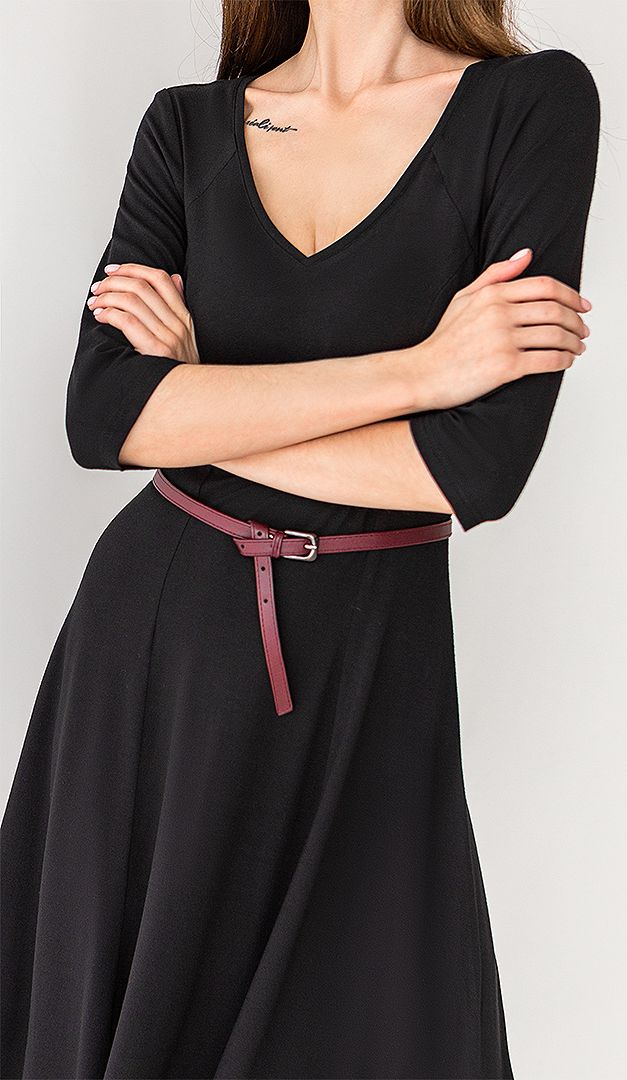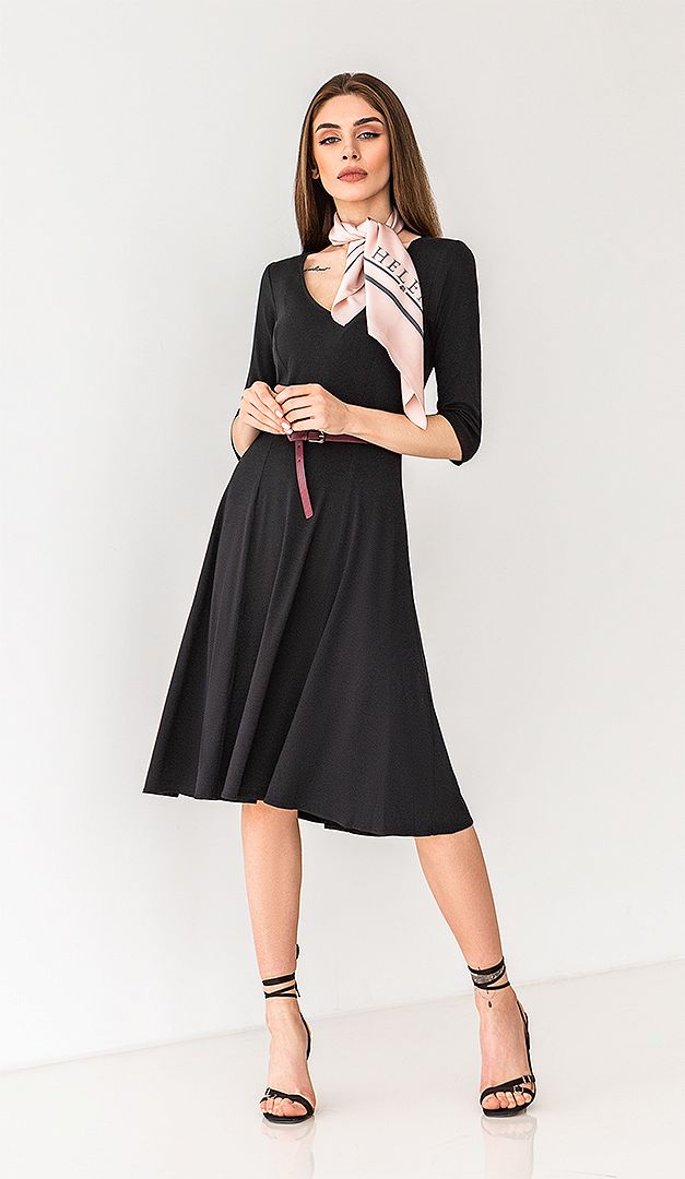 Якщо Ви в пошуках універсального вбрання для щоденних жіночних образвів і для особливих подій, рекомендуємо сукню трикотажну з ременем черну з еластичної бавовняної тканини. Перше, що зачаровує в цій моделі — це дивовижний крій — прилеглий верх і грайливо розкльошений низ. Друге — це лаконічний і в той же час дуже романтичний дизайн. Верх сукні оформлений акуратною V-подібною горловиною, візуально витягаючою силует. Сукня трикотажна з ременем чорна без підкладки та застібок.