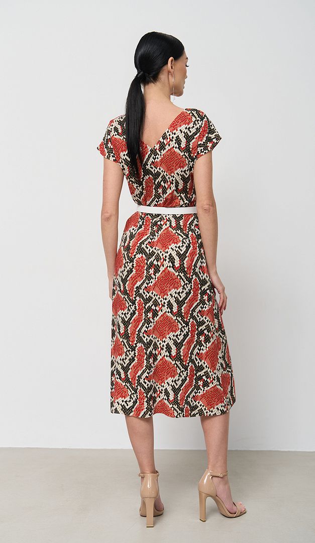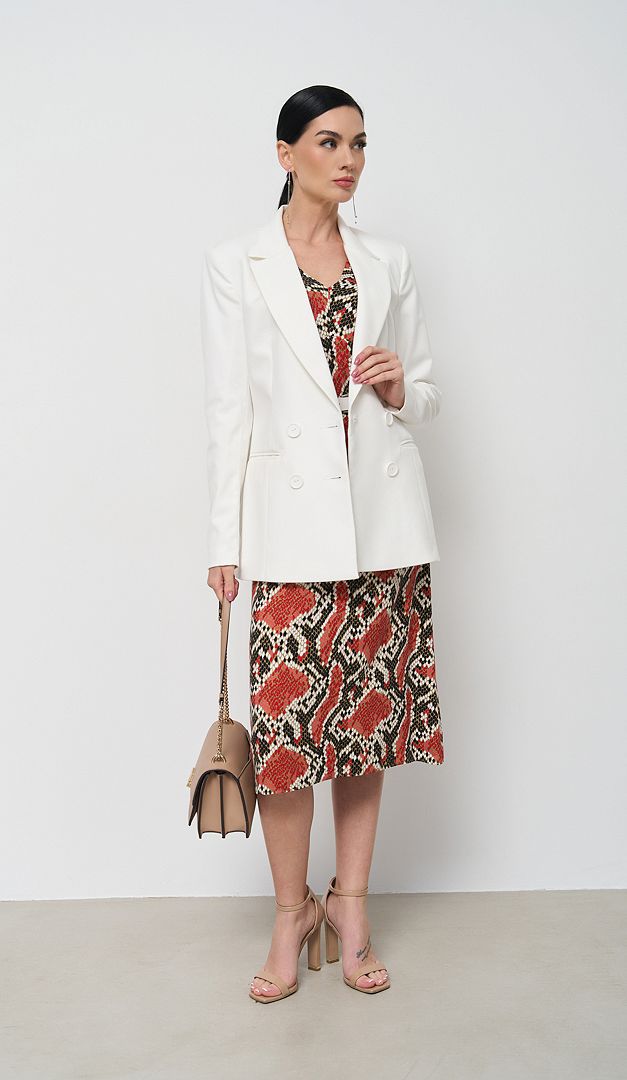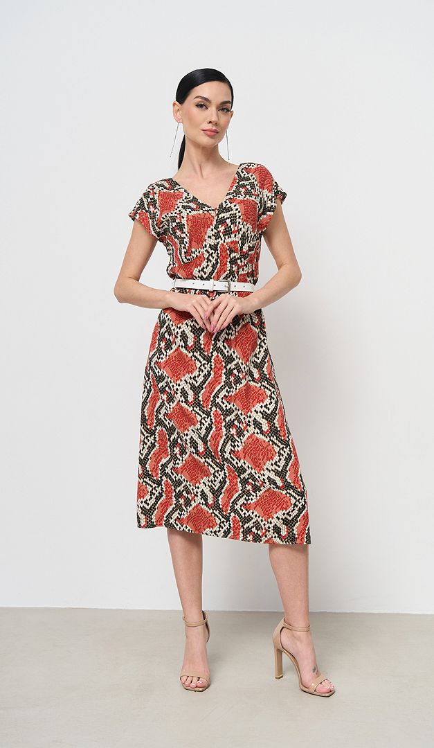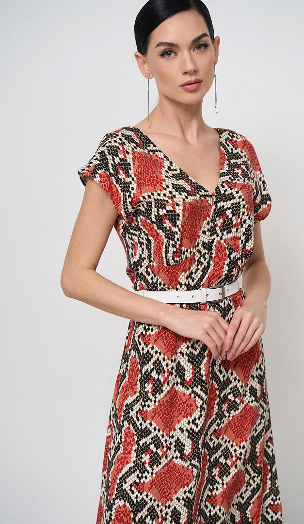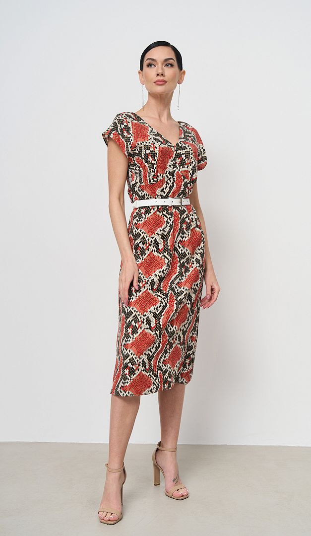 Сарафан літній в зміїний принт стане ефектним нарядом і на кожен день, і для святкових подій! Сарафан літній в зміїний принт має жіночний подовжений силует, витончено розкльошений до низу. V-подібні вирізи горловини візуально витягають фігуру. Лінія плеча злегка збільшена. «Родзинка» цієї моделі в додаткових деталях, які роблять образ більш граційним і виграшним, а саме - в завищеній талії і фігурній кокетці. У бічному шві знаходиться застібка на потаємну «блискавку». Сарафан без підкладки.