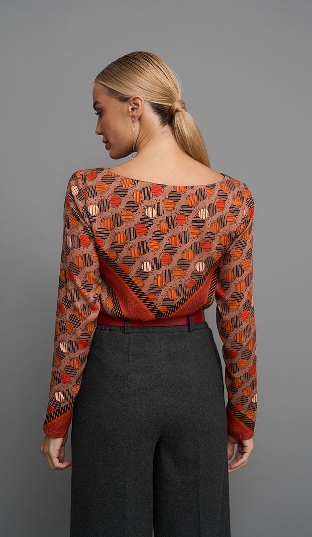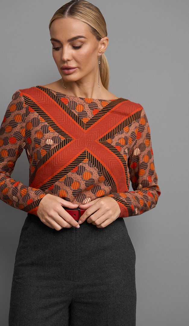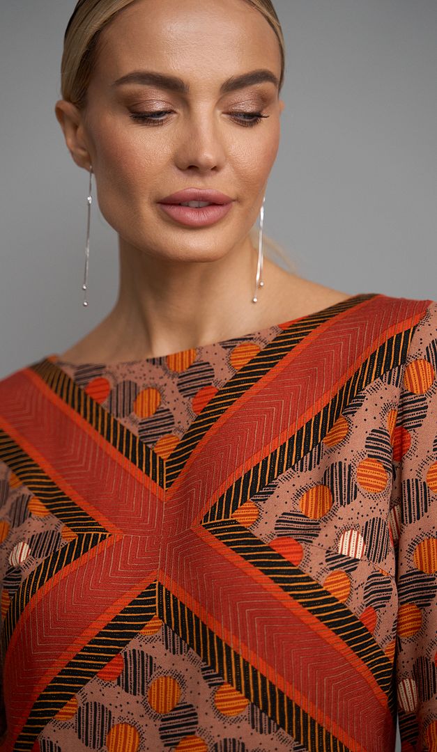Топ жіночий теракотовий з принтом стане Вашим улюбленим! І для цього є багато причин! Вільний силует гарантує комфорт і виглядає стильно в будь-якому розмірі. Дизайн топу жіночого теракотового з принтом розроблений без зайвих деталей, що дозволяє комбінувати його з будь-яким верхом і низом, і використовувати в різних стилях. Акуратний виріз горловини і напівприлеглий прямий рукав підкреслять природну красу своєї власниці. У моделі використаний асиметричний низ з невеликими бічними розрізами для створення модного жіночного образу.
