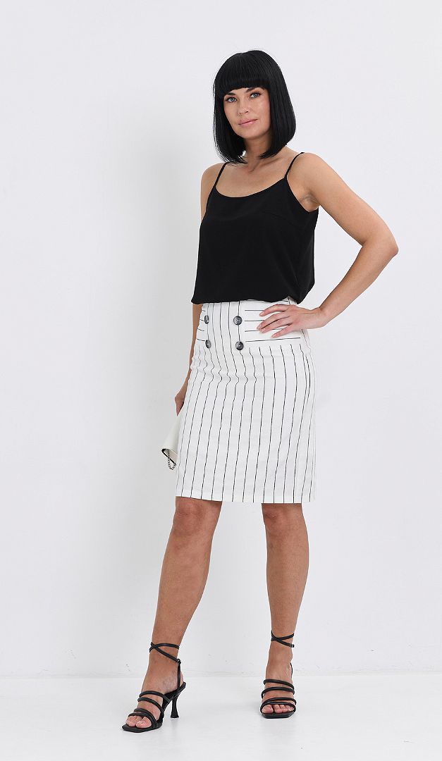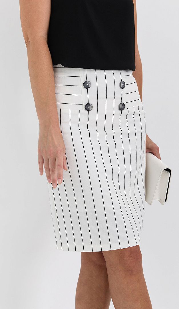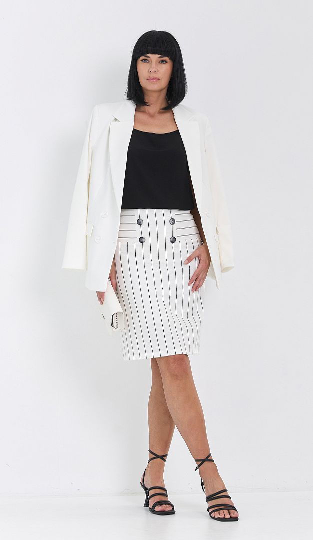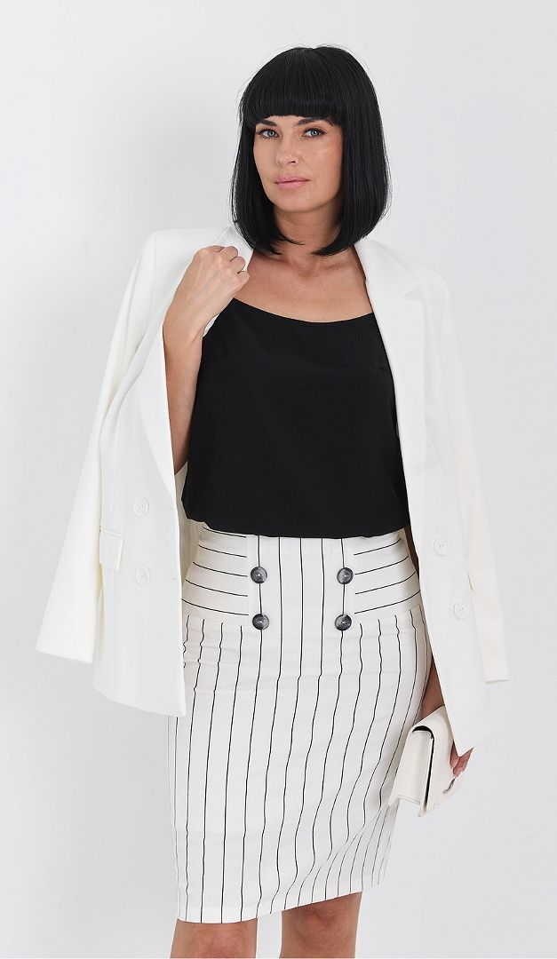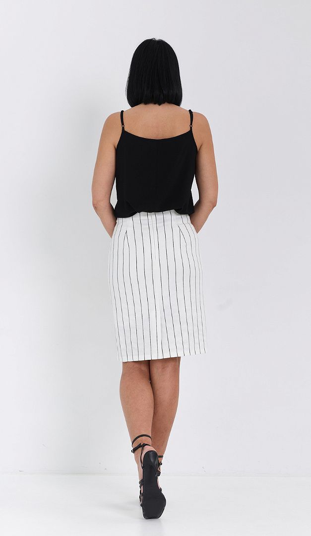 Спідниця біла в смужку спеціально створена для спекотного сезону. Вона ідеальна для офісу, ділових зустрічей і просто для літніх прогулянок! Спідниця біла в смужку має прямий крій зі зручною середньою посадкою по талії. Оригінальне оформлення верху візуально талію і стегна робить витонченіше. Застібається спідниця на застібку-«блискавку» в середньому шві задньої частини. Зсередини — на тонкій підкладці.
