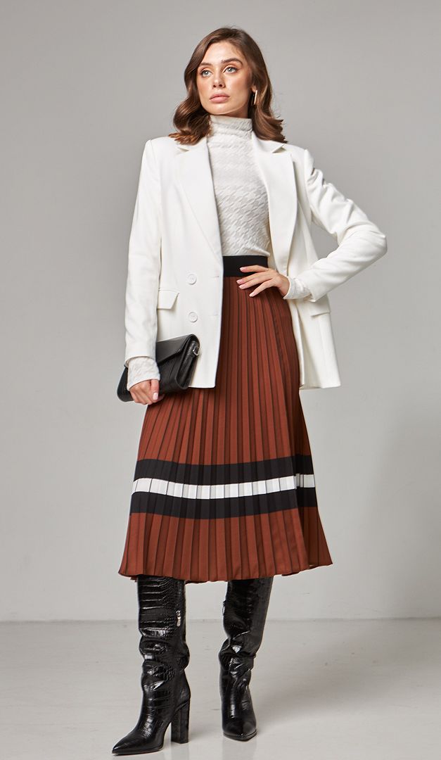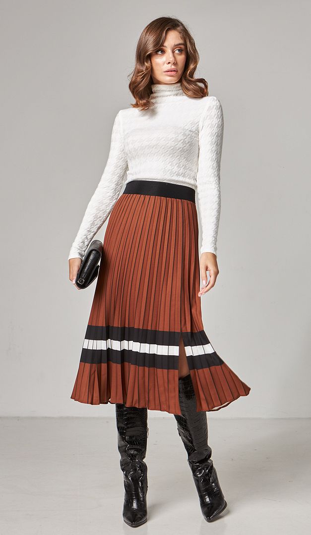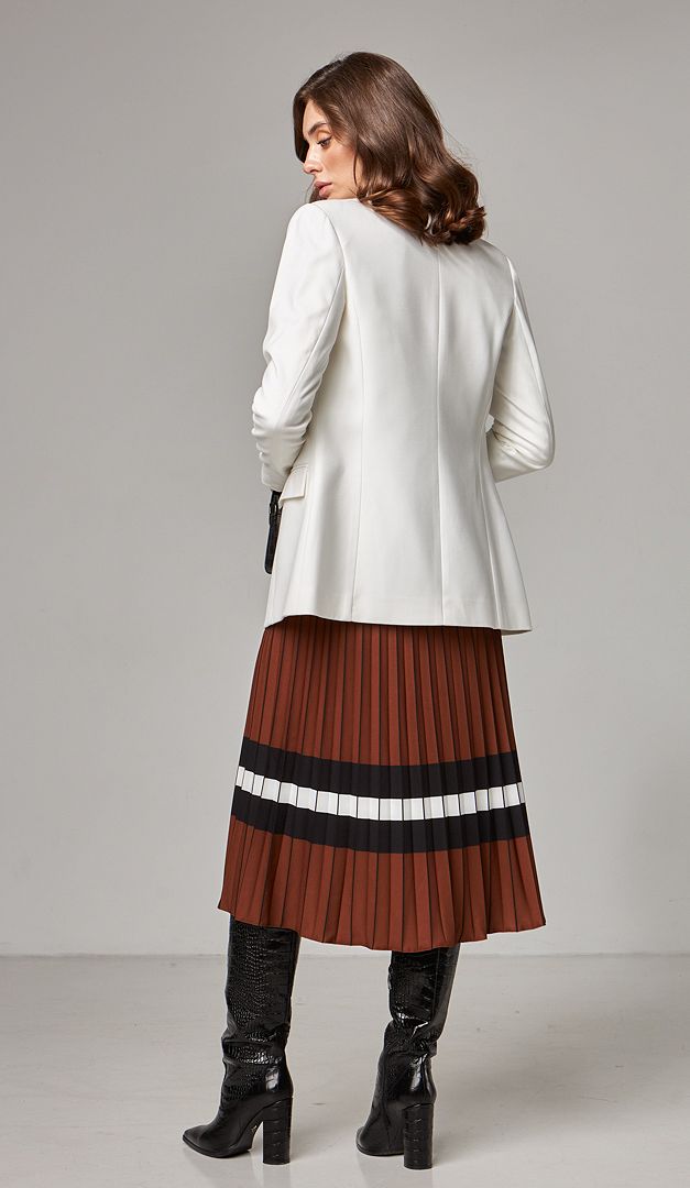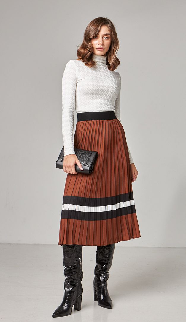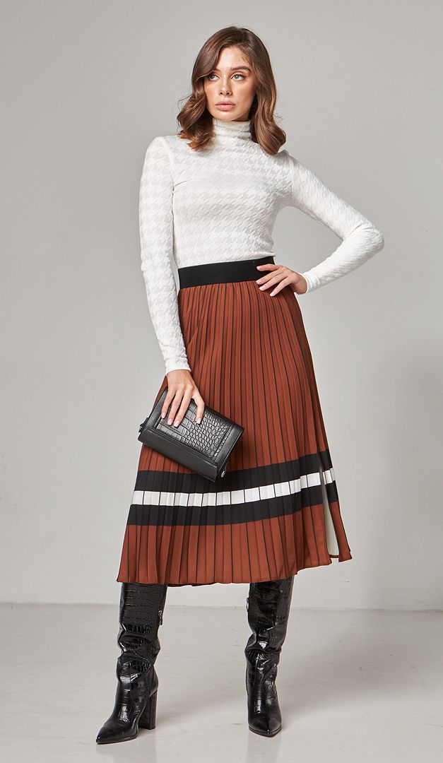 Одна з найкрасивіших спідниць з модного «гофре» гарантує Вам яскравий і ефектний образ! У цій моделі стильної довжини «міді» гармонійно поєднується лаконічний дизайн і зачаровуючі модні принти. Верх виробу оформлений контрастною еластичною резинкою. Ще один кокетливий штрих спідниці Фернанда — це акуратна бічна розпірка. Саме ця річ стане виграшною і акцентною в ошатному і в повсякденному look-ах. Виріб без підкладки та застібок