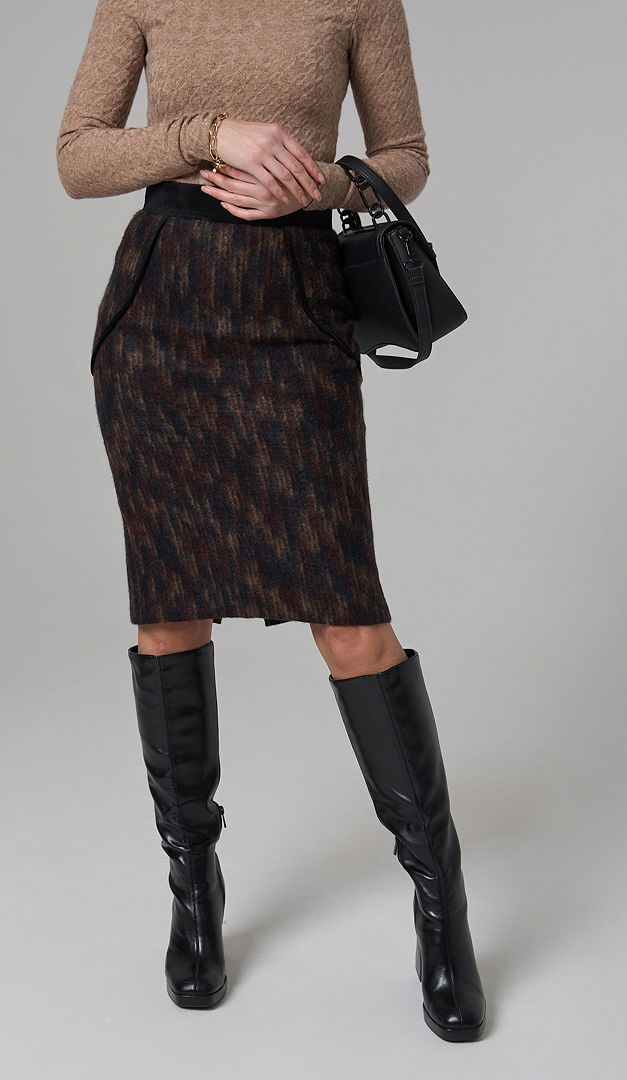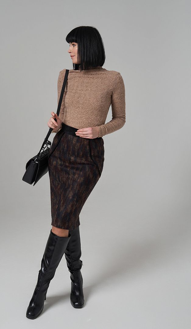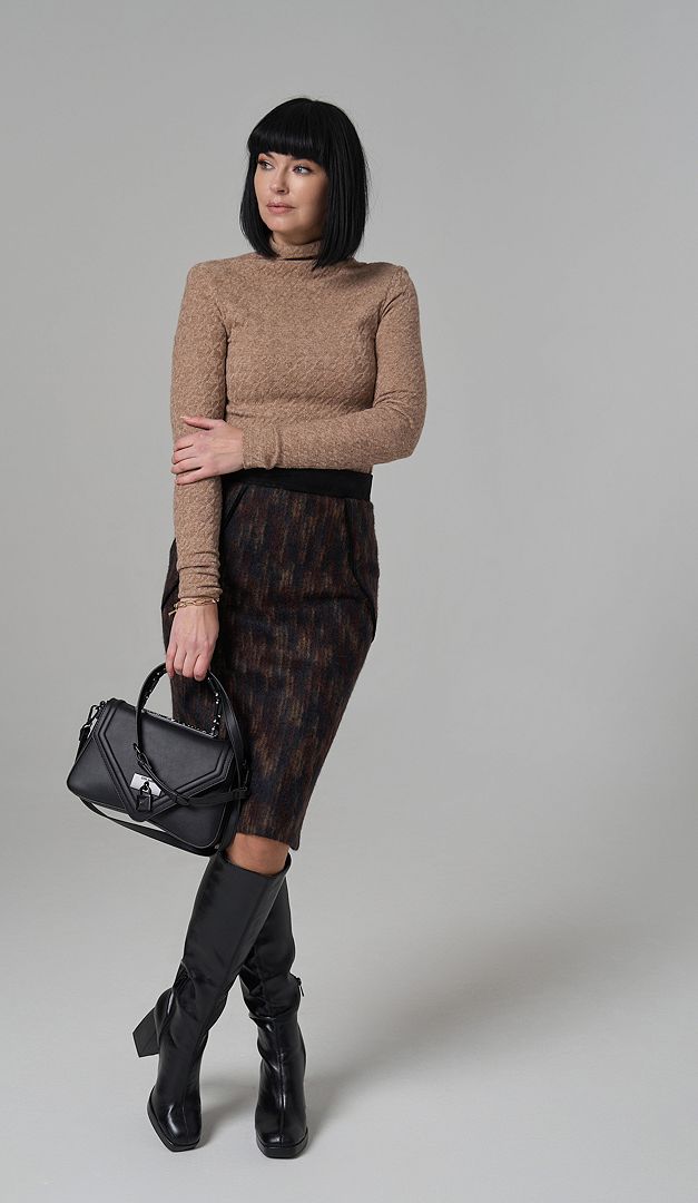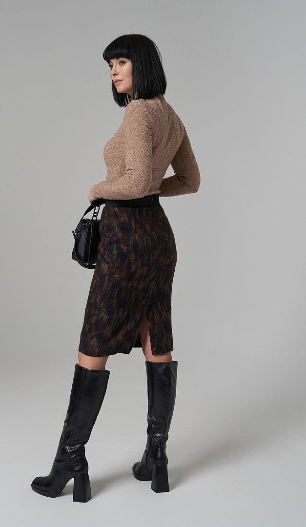 Це утеплений варіант класичної спідниці, який Вам дозволить дотримуватися дрес-коду, чудово виглядати і відчувати себе при цьому комфортно. Спідниця олівець тепла в принт має середню класичну посадку. Талія контрастно підкреслена поясом, а стегна — оригінальними декоративними кантами в тон верху. Напівприлеглий прямий крій цієї утепленої спідниці дозволить зберегти жіночність і граційність фігури в будь-якому розмірі. Модель має застібку «блискавку» в середньому шві задньої частини, акуратну шліцу, а також підкладку.