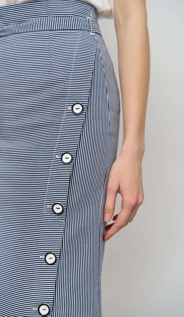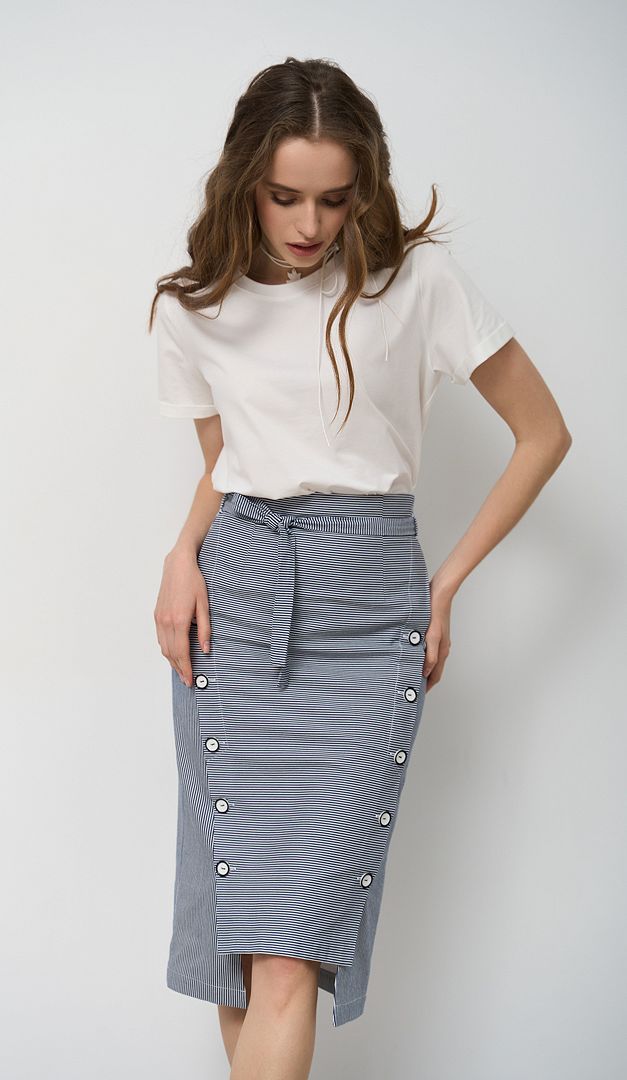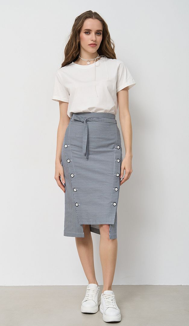 Універсальна практична модель. Для роботи та офісу комбінуйте спідницю міді в смужку з жакетом і блузою, для прогулянок і подорожей — з топом і з взуттям на низькому ходу. Передня частина виробу злегка вкорочена і по краях доповнена ґудзиками. Два ряди ґудзиків знизу — функціональні, тому з їх допомогою можна створити бічні розпірки. Лінію талію в спідниці міді в смужку підкреслює знімний пояс з аналогічної тканини. Виріб на підкладці.