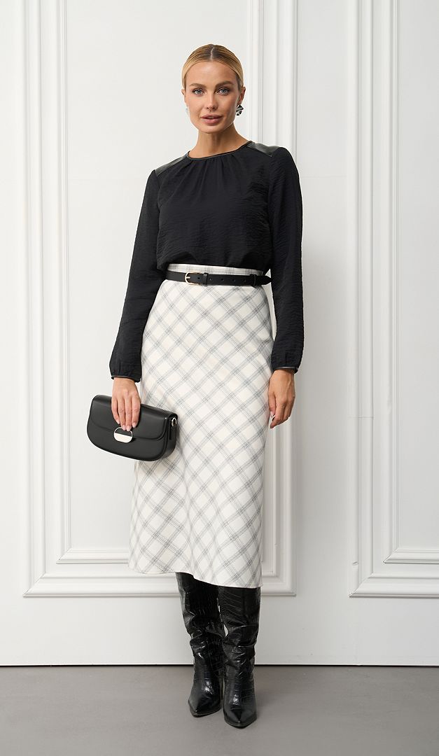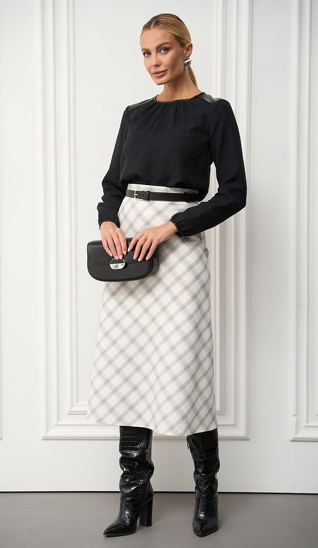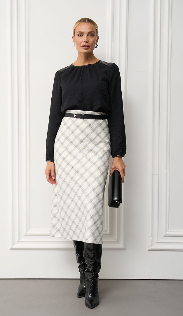 Якщо хочете внести різноманітність в свій базовий гардероб, рекомендуємо вам незвичайну і дуже ефектну спідницю трапецію молочну в клітинку. Модель виготовлена з тканини, що не мнеться середньої щільності, в витончений і актуальний принт «клітинка». Спідниця трапеція молочна в клітинку має зручну середню посадку по талії. Верх оформлений тонким настроченим поясом. Застібається на «блискавку» в середньому шві заднього полотнища. Подовжений фасон «трапеція» допоможе вам створити елегантний образ і при цьому стрункий силует, не залежно від розміру. На підкладці.