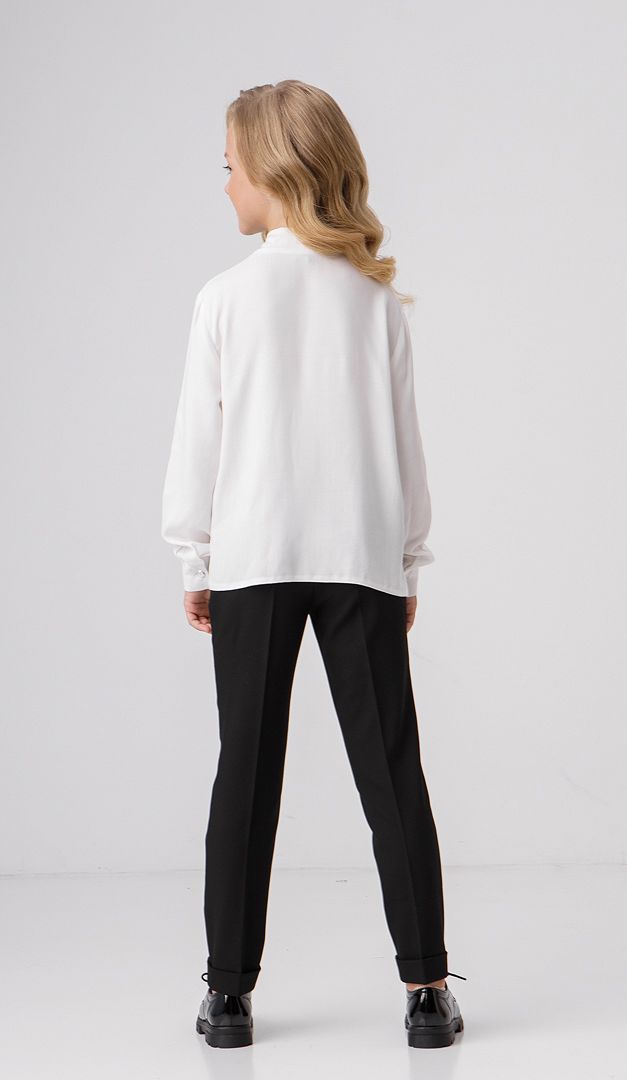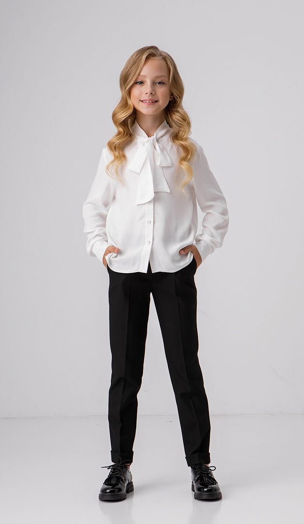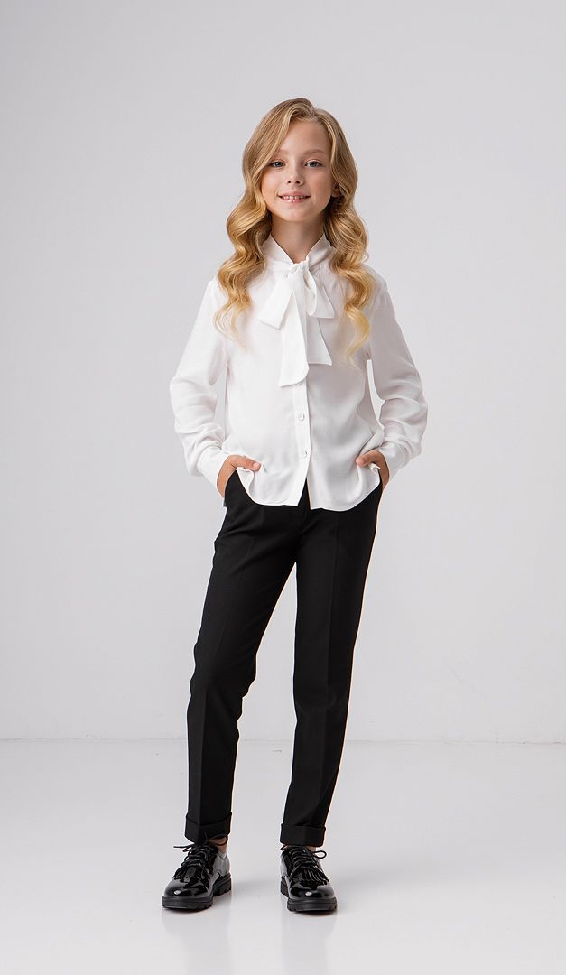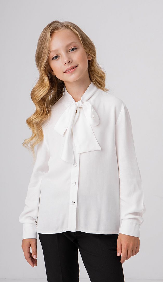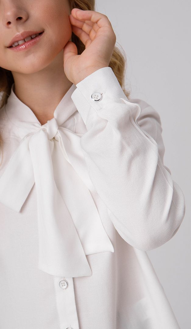 Біла блуза з коміром-бантом і довгим рукавом елегантно доповнить гардероб кожної школярки. Виріб має прямий напіввільний крій. Родзинка білої блузки — це невисокий комір-стійка, що переходить в бант, що витончено зав'язується спереду і функціональну застібку на ґудзики. Рукава по низу оформлені манжетами з застібкою на один ґудзик.