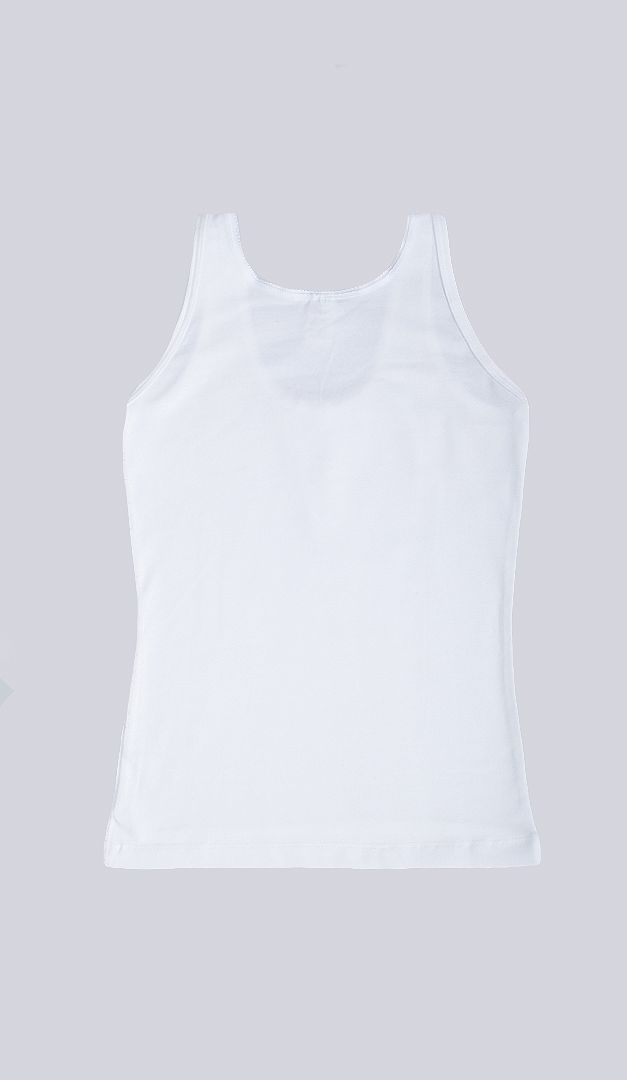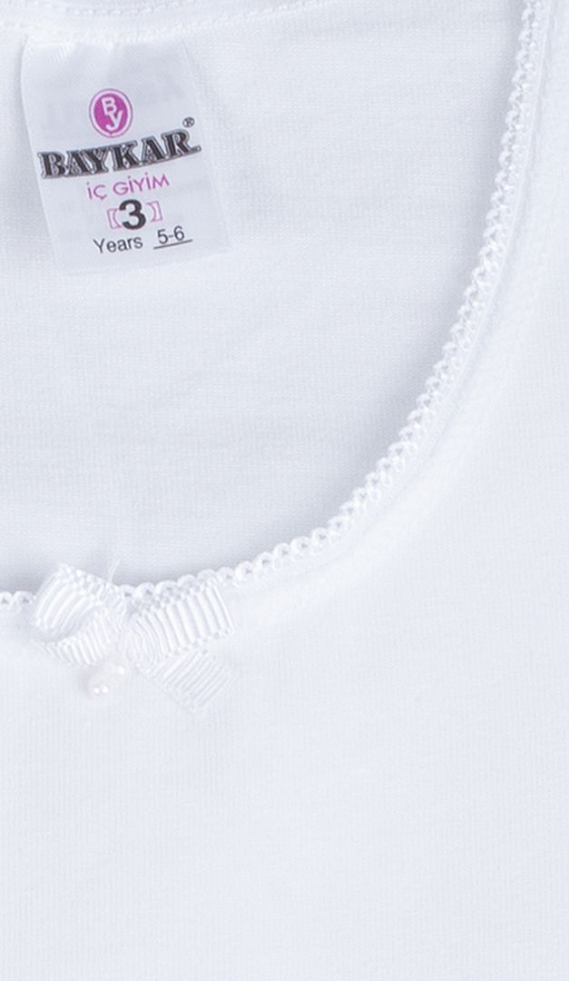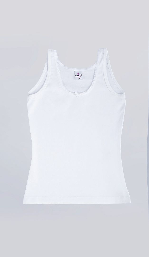 Дитяча майка для дівчаток шкільного віку. Виріб виконаний з натуральної якісної тканини, приємної і мякої на дотик. Модель напівприлеглого силуету, з неглибоким напівкруглим вирізом горловини і широкими бретельками. Горловина моделі оформлена красивою ажурною окантовкою і по центру прикрашена миловидним бантиком. Така білизна ідеально підійде як під святкове вбрання, так і під шкільну форму.