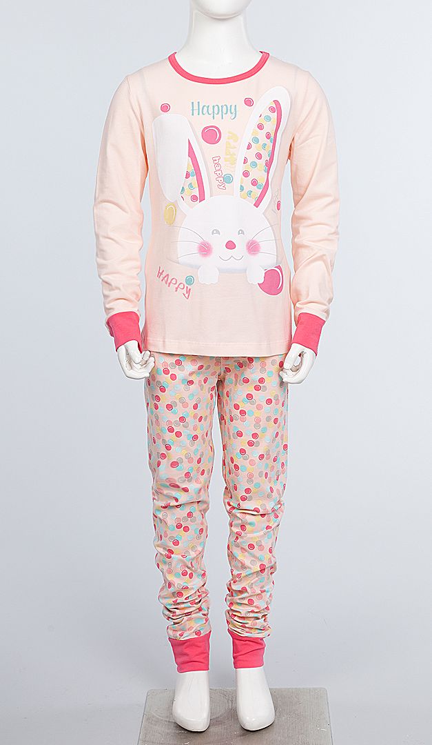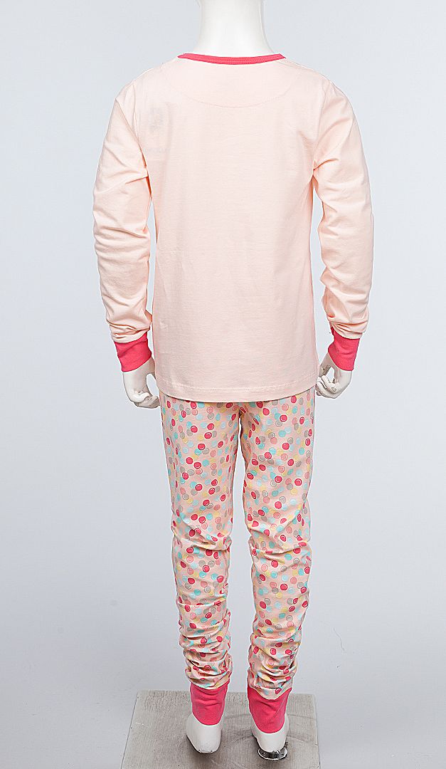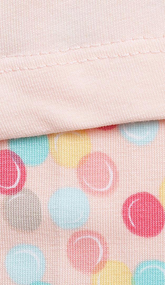 Миловидна піжама-комплект для дівчинки. Модель складається з двох виробів: кофти і штанів. Кофта має неглибокий округлий виріз горловини, окантований контрастною планкою. Модель злегка розкльошеного до низу крою з довгим рукавом, крім того, на передній поличці розміщений оригінальний аплікаційний малюнок, що надає піжамі особливого настрою і миловидності. Штани прямого вільного крою з м'якою еластичною резинкою. Родзинка виробу — веселий барвистий принт з різнокольоровими кульками. Така піжама неодмінно стане улюбленим домашнім одягом для Вашої маленької принцеси.
