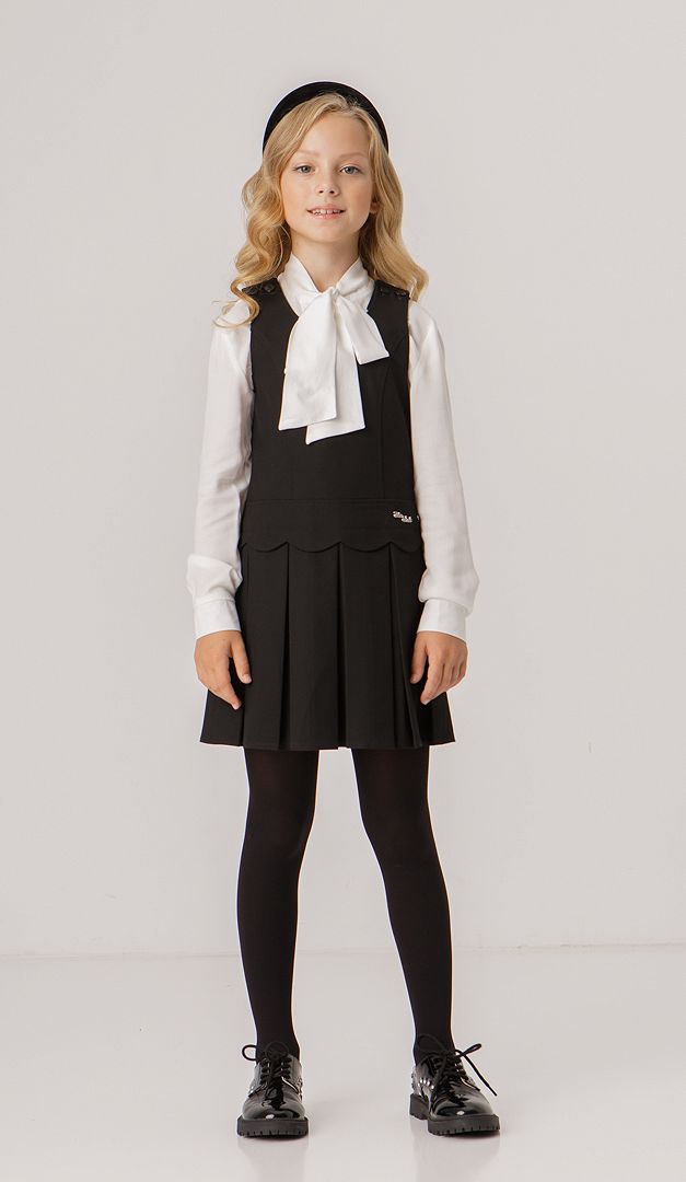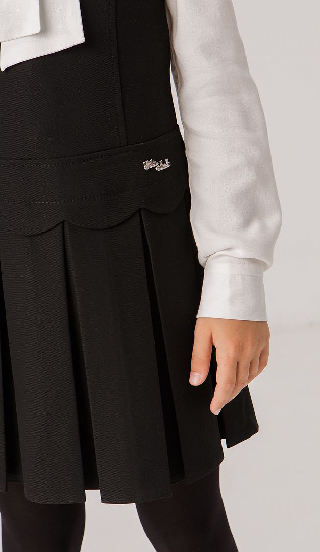 Сарафан з фігурним оздобленням сподобається Вам своїм кокетливим дизайном і практичністю. Модель на бретелях що застібаються, які можна зробити коротше за рахунок ґудзиків. Це дуже зручно для регуляції довжини в залежності від росту дитини. Гарному приляганню по поличці і спинці сприяють фігурні рельєфи. Головна "родзинка" сарафана — це занижена лінія талії, оригінально доповнена фігурним поясом-кокеткою. У бічному шві знаходяться потаємна застібка- "блискавка". Також сарафан має злегка розкльошений низ в зустрічну складку. Без підкладки.