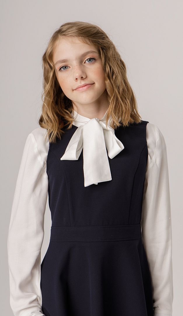 На фото створений образ із блузкою з коміром-бантом (арт.970).