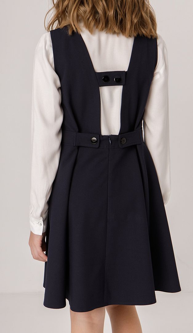 Кокетливий кльошний сарафан з планкою спеціально розроблений для юних модниць, Він має гарний силует, що складається з прилеглого верху і грайливо розкльошеного низу. Лінія талії з середньою посадкою підкреслена відрізним настроченим поясом. На особливу увагу заслуговує оригінальна спинка сарафана з милими складками на спідничній частині, а також з додатковими застібками на ґудзики і "блискавку". Модель без підкладки