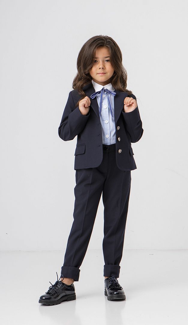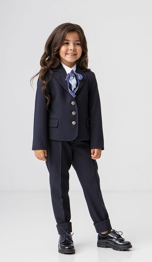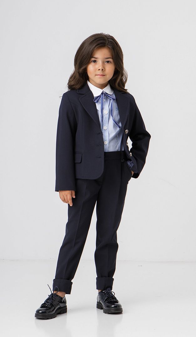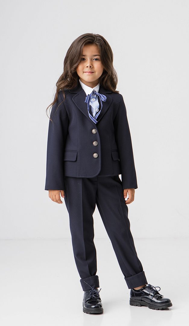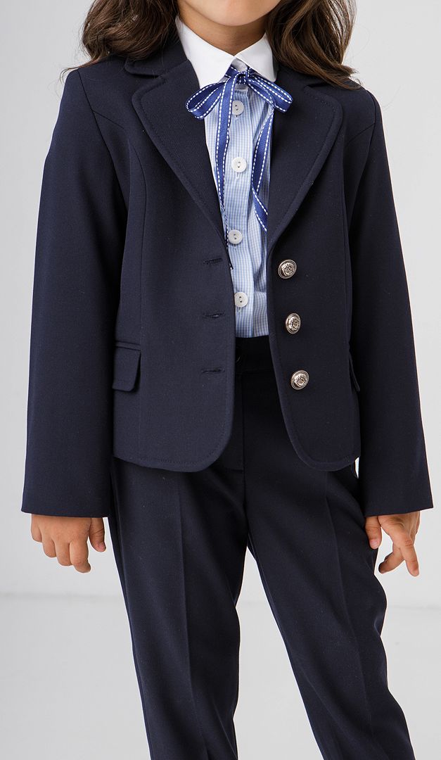 Класичний жакет для юних леді ефектно прилеглого силуету. Виріз горловини оформлений акуратним відкладним коміром, перехідним в застібку на ґудзики. Поличка жакета оформлена фігурними рельєфами, а також функціональними кишенями з клапанами. Рукав — прямий, прилеглий з додатковим запасом тканини зсередини. Модель на підкладці.