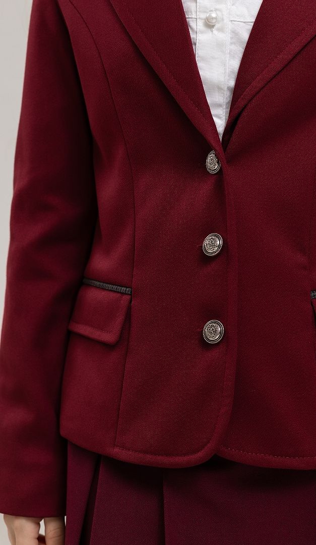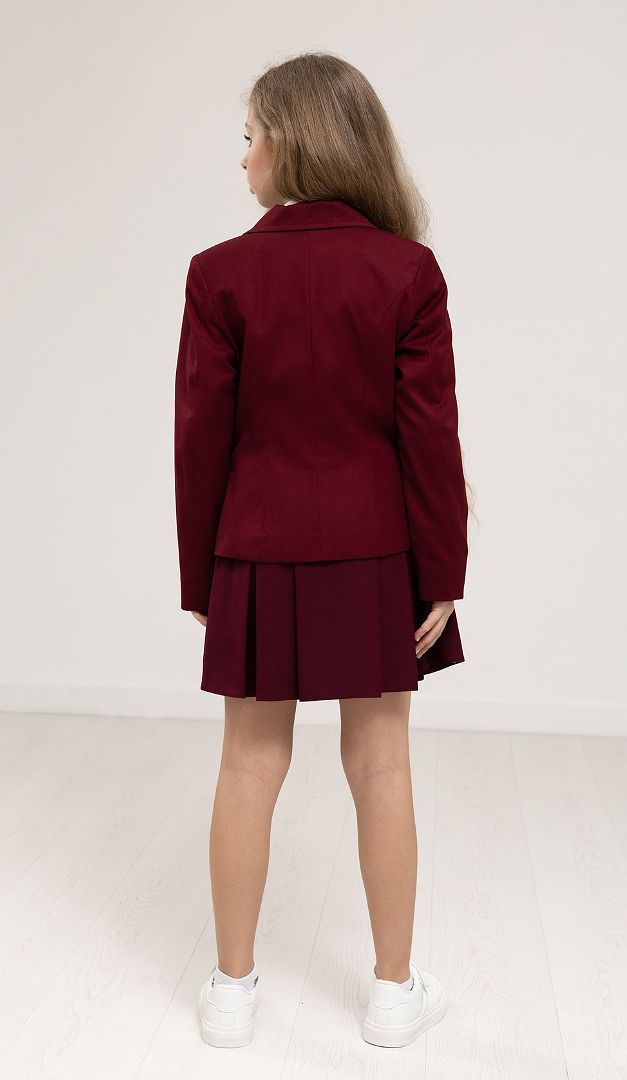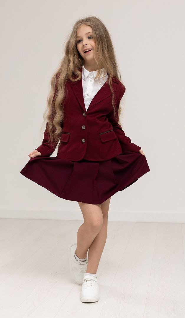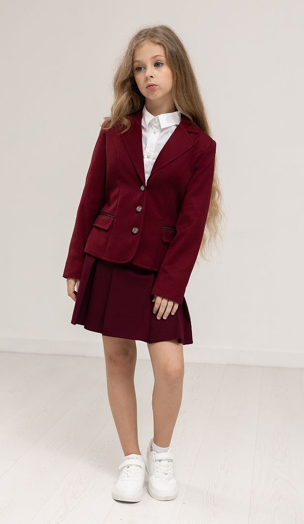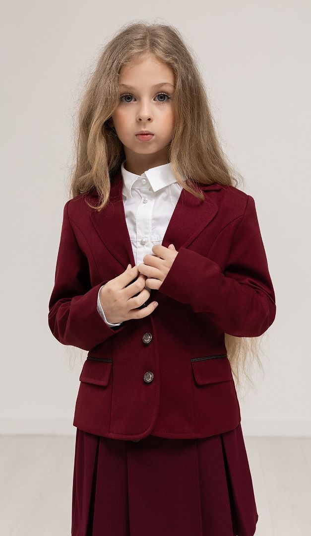 Жакет для дівчинки з оздобленням має прилеглий і відмінно сідаючий по фігурі, завдяки фігурним рельефам, силует. Передня частина жакета благородно оформлена акуратним коміром з округлими вилогами. Ця модель стильно доповнена оригінальними прорізними кишенями, прикрашеними контрастним кантом і накладними клапанами. Прямий двошовний рукав зсередини має додатковий запас тканини. Виріб на підкладці.