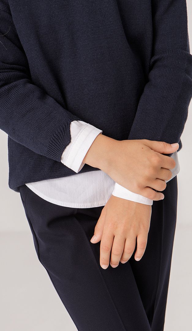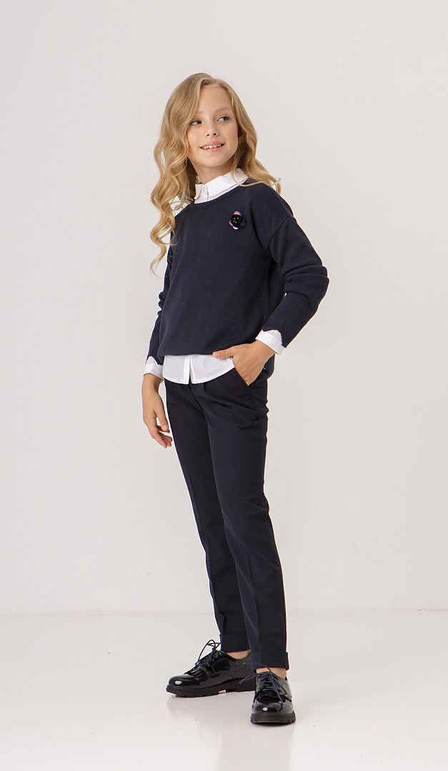 Джемпер для дівчинки синій — красива і дуже потрібна річ в гардеробі школярки. Вона не тільки стильно доповнить образ, а ще й подарує тепло і комфорт. Модель має вільний прямий силует зі стильно подовженою задньою частиною. Низ джемпера і низ манжету оформлений еластичною планкою. Ще одна деталь, яка неодмінно сподобається кожній модниці - це мила декоративна брошка.