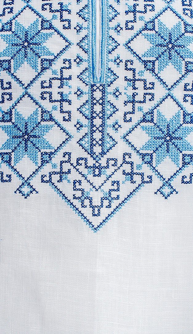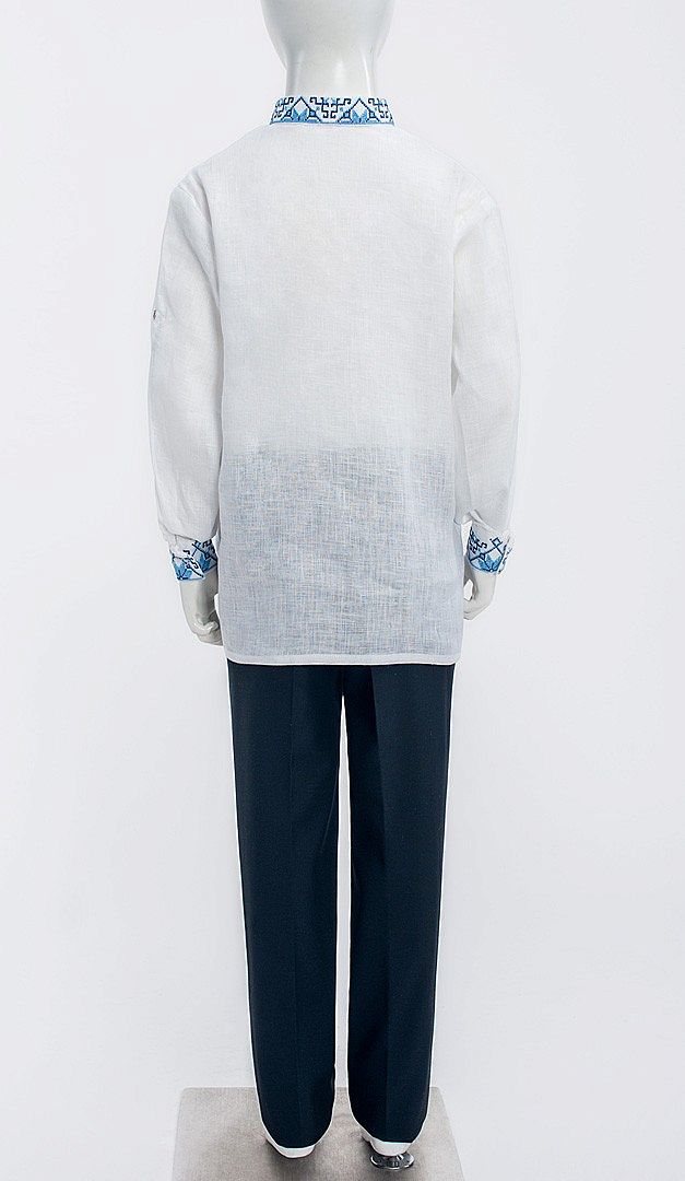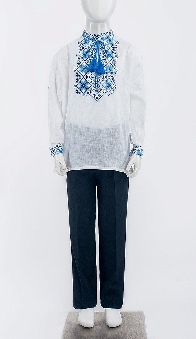 Неймовірно святкова і стильна вишиванка для хлопчика вільного прямого крою. Виріз горловини оформлений класичним коміром-стійкою, що зав'язується на шнурівку з "пензликами" і плавно переходить в глибокий виріз по центру полички. Оригінальна вишивка хрестиком з комбінацією двох кольорів, прикрашає комір, центр полички, манжети рукавів і відрізняється своїм неповторним колоритом і національними традиціями нашої країни. Ще одна функціональна перевага даної моделі — додаткова можливість формувати короткий рукав, завдяки спеціальній планці, яка також прикрашена вишивкою і застібається на одну кнопку. Така вишиванка неодмінно припаде до смаку сучасному маленькому чоловікові, створюючи при цьому дуже багатий і шляхетний вид.