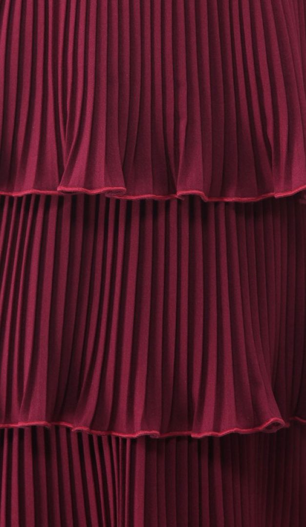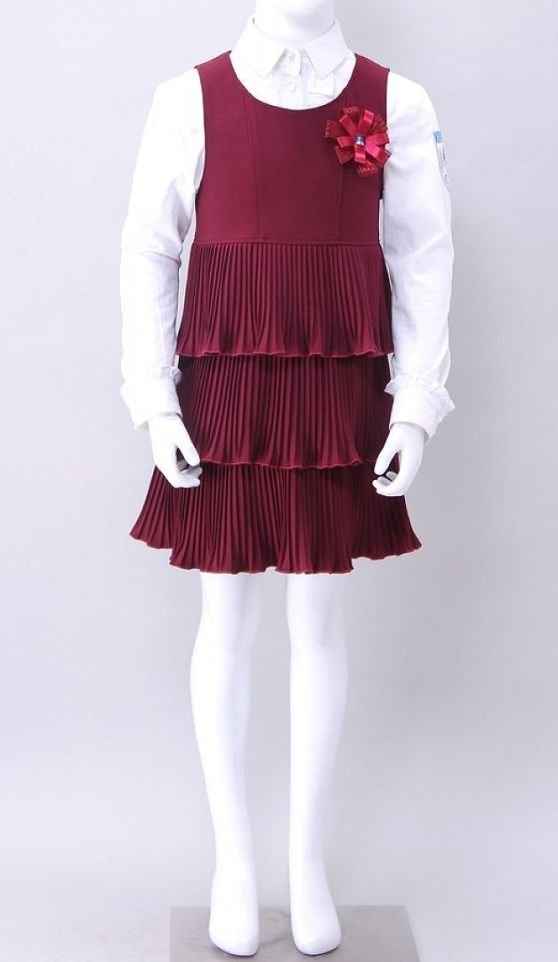 Ошатний сарафан із завищеною лінією талії для дівчаток шкільного віку. Поличка оформлена неглибоким округлим вирізом горловини, двома прямими рельєфами, а також елегантно прикрашена декоративною брошкою-квіткою. Додаткової святковості сарафану надають три ряди кокетливо гофрованих рюш. Спинка оформлена двома рельєфами і має застібку на потаємну блискавку, розташовану в середньому шві.